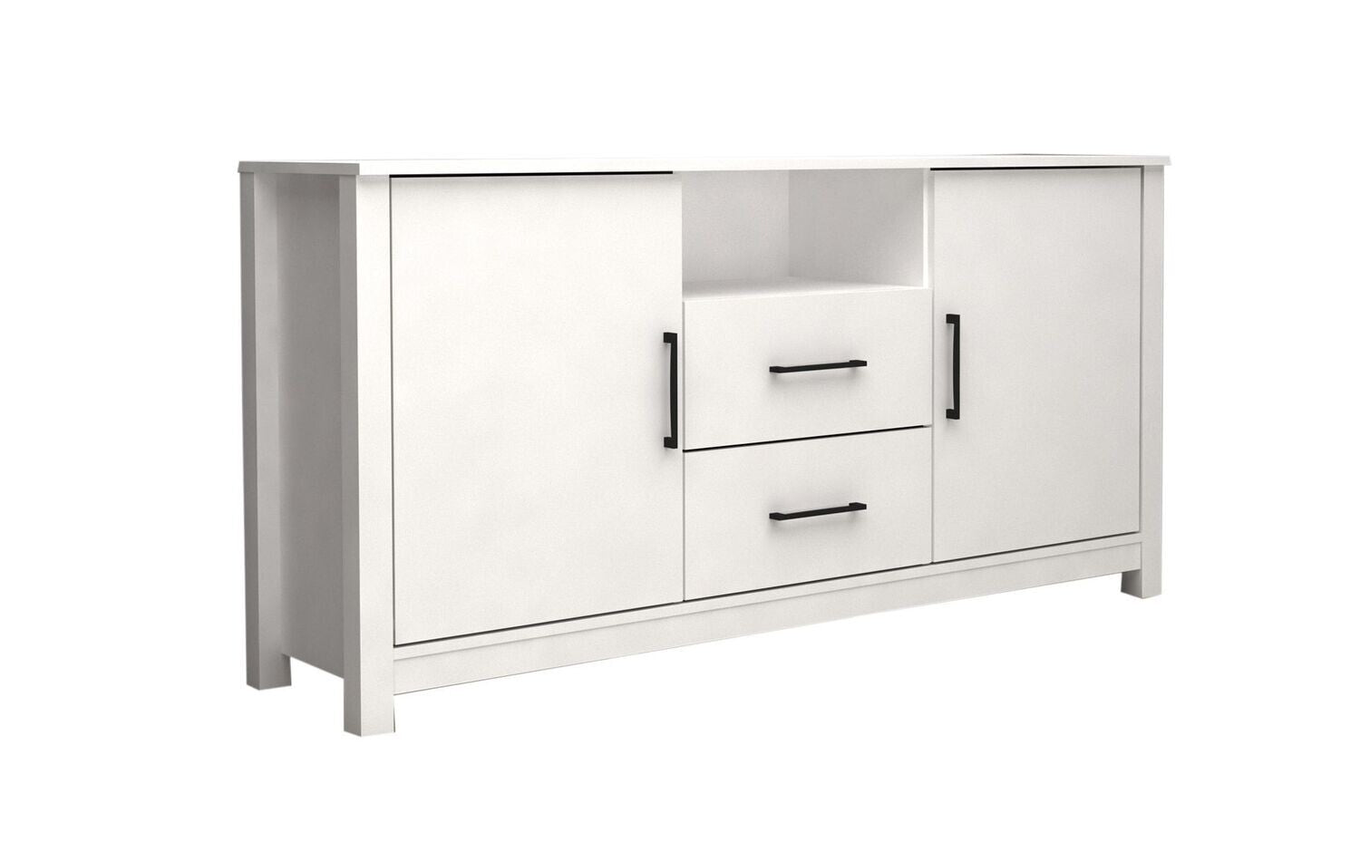 Aparador 2 Puertas DN 159x82cm Este mueble versatil y moderno es la adicion ideal para cualquier espacio de tu hogar, brindando tanto almacenamiento adicional como un toque de sofisticacion. Con dos amplias puertas, este aparador te ofrece un acceso conveniente a un generoso espacio interior. Ademas, cuenta con dos cajones espaciosos que te permiten guardar objetos mas pequeños o de valor personal, y un hueco central para decoracion. El diseño elegante y contemporaneo de este mueble se adapta a cualquier estilo de decoracion. Sus líneas limpias y acabados cuidadosamente seleccionados brindan un aspecto moderno y atractivo que complementara tanto espacios minimalistas como aquellos con una estetica mas tradicional. Fabricado con materiales de alta calidad y atencion al detalle, nuestro a...