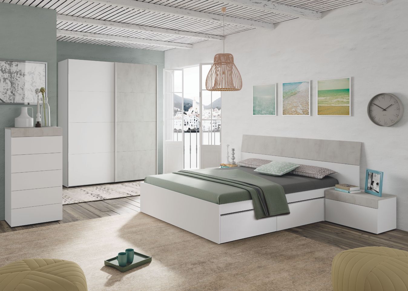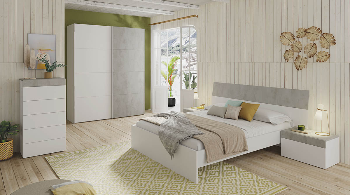 Cabecero de Cama 276x40 cm. Cabezal + Dos Mesitas Tekkan El Cabecero de Cama 276x40 cm. Cabezal + Dos Mesitas es un completo conjunto de dormitorio que incluye un cabezal apto para camas de 135 cm o 150 cm y dos mesitas de noche con un cajon cada una. Podras decorar tu dormitorio a un precio increible. Gracias a su elegante diseño, este mueble dara un toque moderno a tu habitacion. En color blanco artik y gris cemento, este conjunto aportara luminosida y un toque decorativo en la habitacion. Fabricado en melamina de alta calidad. El cabezal es colgante e incluye dos patas que se apoyan en el suelo, ofreciendote una maxima estabilidad. Las mesitas, por su parte, incluyen cajones extraibles sin tiradores y soportan un peso maximo por cajon de 5 kg. Cada mesita soporta un peso total maximo...