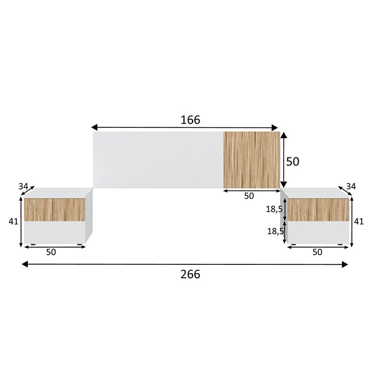 Cabecero de Cama Ethna 266x34cm. Cabezal + Dos Mesitas El cabecero de cama es el punto focal perfecto para tu espacio de descanso. Su construcción sólida asegura durabilidad a lo largo del tiempo. El conjunto incluye dos mesillas de noche, cada una con dos cajones espaciosos. Estas mesillas son ideales para mantener tus objetos esenciales al alcance de tu mano mientras mantienes tu espacio organizado. Los cajones te brindan espacio para guardar libros, gafas y otros artículos personales. Guías correderas metálicas para el cajón. Patas ABS (termoplástico de alta resistencia) ocultas para la parte inferior del mueble. Para camas de 160 cm, las mesitas sobresalen del cabezal por los lados. Peso máximo soportado por cada cajón 5 kg. Peso máximo soportado por mesita total 15 kg. Medidas: Alt...