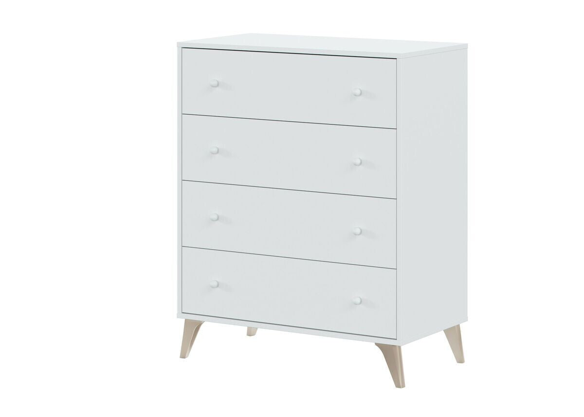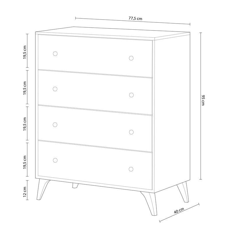 Comoda Sweet 4 Cajones 78x95 cm La Comoda 4 Cajones 78x95 cm presenta un estilo nordico, con unas lineas rectas y naturales que la hacen realmente unica. Los detalles decorativos, como los tiradores de bola y las patas ligeramente inclinadas, hacen de este mueble una pieza ideal para tu habitacion. Su presencia aportara frescura y luminosidad ademas de ayudarte con la capacidad de almacenaje. La Comoda 4 Cajones 78x95 cm es ideal para almacenar toda la ropa doblada que ya no cabe en el armario. De aspecto muy neutro, es perfecta si te apetece jugar con los colores de la ropa de la cama, ya que no le quitará protagonismo. Fabricada en melamina de alta calidad, la Comoda 4 Cajones 78x95 cm cuenta con 4 cajones no extraibles con guias correderas metalicas. El acabado es en blanco artik, lo...
