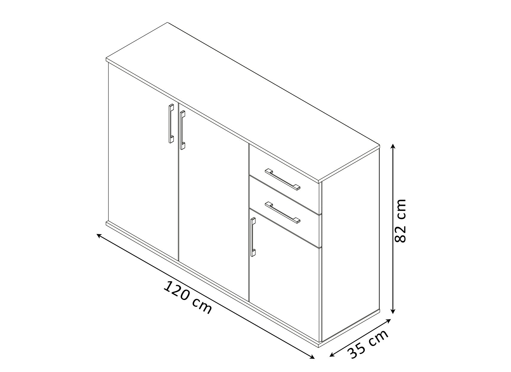 Comoda Aparador Joana 120x82cm 3 Puertas y 2 Cajones Potencia la organización y el estilo en tu hogar con nuestra cómoda multifuncional de 3 puertas batientes y 2 cajones. Esta pieza versátil puede ser tanto una cómoda como un elegante aparador, adaptándose perfectamente a tus necesidades. En su interior, encontrarás una balda que te ofrece espacio adicional para organizar tus pertenencias. Ya sea en el dormitorio, sala de estar o comedor, esta cómoda es un ejemplo de funcionalidad y diseño. Facil montaje. Medidas: Alto: 82 cm Largo: 120 cm Ancho: 35 cm Ref.: JOANA-3D-2DR