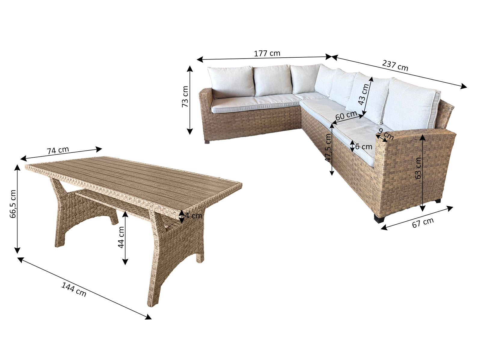 Sofa Rinconera + Mesa de Ratan PE Marron. Muebles de Jardin y Terraza Disfruta del máximo confort y estilo en tu terraza con este conjunto de sofá rinconera y mesa de ratán PE en color marrón. Diseñado para espacios exteriores, combina durabilidad y elegancia, creando un ambiente perfecto para relajarte o compartir momentos inolvidables. Su estructura resistente y materiales fáciles de limpiar garantizan una larga vida útil, mientras su diseño compacto aprovecha al máximo el espacio disponible. Transforma tu jardín o terraza en un oasis acogedor y sofisticado. Medidas Mesa: 144x66.5x74 cm Medidas Sofa: Alto: 73 cm Ancho: 237 cm Largo: 177 cm Ref.: YJXS-24011
